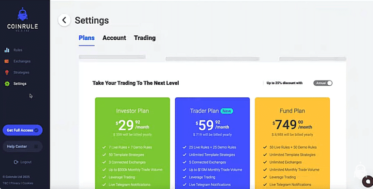 When you log into Coinrule, you’ll land on the rules dashboard. This is the page that’s in front of us. account. Other pages include the exchanges page where you can go to connect exchanges or wallets, the strategies page where you can have a look through and use pre-made templates, the data studio where you can view certain indicators, price data, all extracted from Trading View, and your settings page where you can change your notification settings. You can change certain trade settings and other potential alerts that you may have. By heading over to get full access, you can subscribe to a plan and unlock further features. So on the main rules dashboard, you can filter by all active, draft, paused, completed, and you can tick this on and off to show or not show your demo rules. Also on the right hand side here, you can sort your strategies by profit, loss, profit per trade, win rate, allocation, and by the time that they’ve been launched, get set up and create your first rule.
